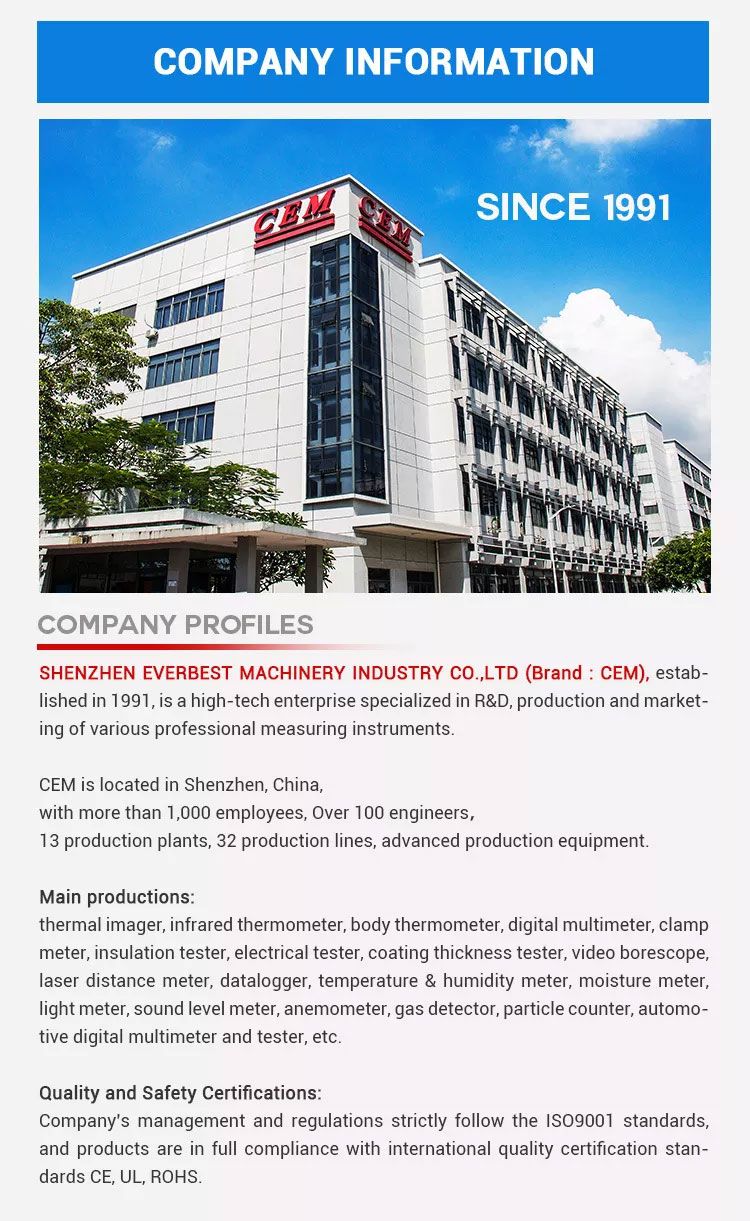 کمپانی CEM موفق به کسب استانداردهای بین المللی ISO 9001 کیفیت، CE – UL و ROHS شده است، این برند رنج وسیعی از ابزارهای NDT مانند انواع مولتیمتر، دوربین های ترموویژن، گاز سنج، پارتیکل کانتر، متر لیزری، دوربین های بازرسی بروسکوپ، دماسنج های پزشکی و صنعتی و غیره را تولید میکند.