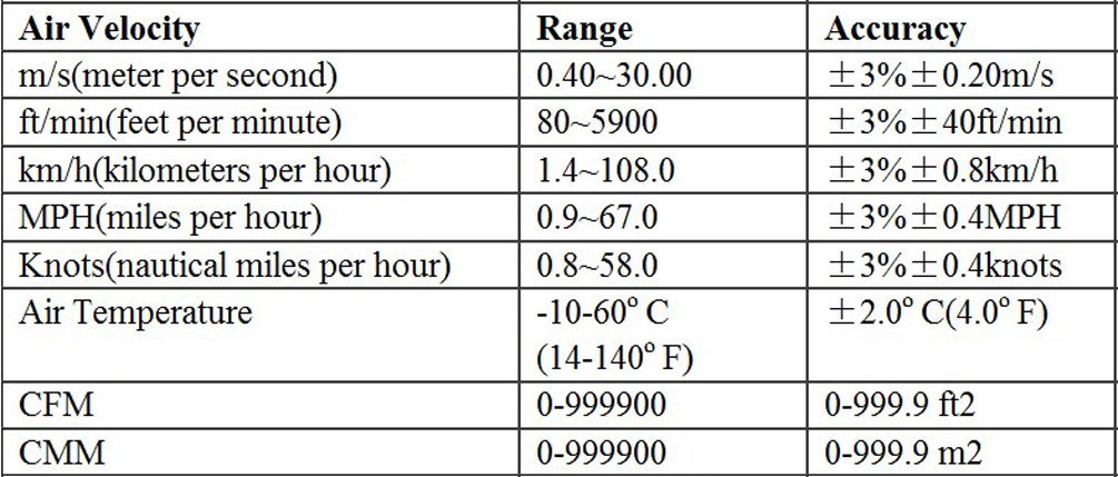 • اندازه گیری سرعت باد با دقت 3%  و رزولوشن 01m/s  بر حسب واحد m/s در محدوده 0.4 ∼ 30