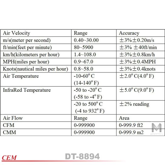 ویژگی های بادسنج، فلومتر و دما سنج (ترمو آنمومتر) CEM DT-850
