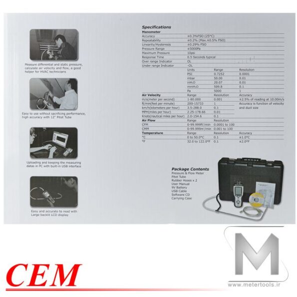 DT8920 CEM مانومتر فشارسنج تفاضلی، دماسنج و فلوی هوا