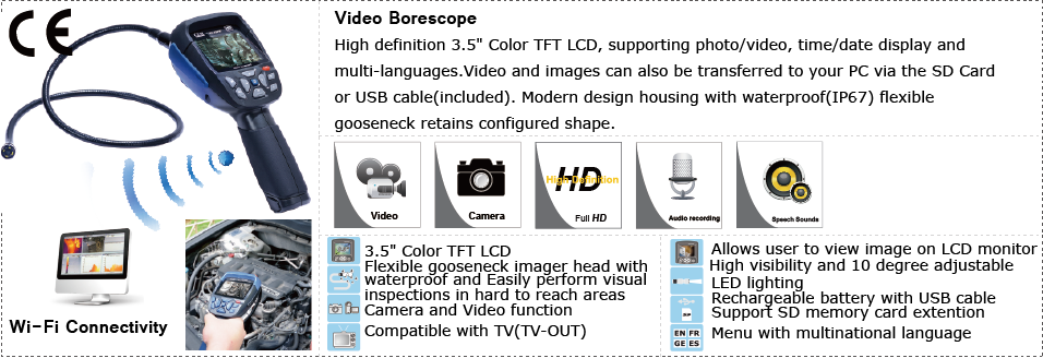 این دستگاه یک دوربین بازرسی با ویدئو بروسکوپ می باشد که به وسیله آن می توان از محل های غیر قابل دسترسی بازدید نمود مانند: داخل سیستم های مکانیکی ، موتور خودرو و… . در این محصول تصاویر بر روی یک TFT LCD 3.2 اینچی با رزولوشن 320×240 نشان داده می شوند.
