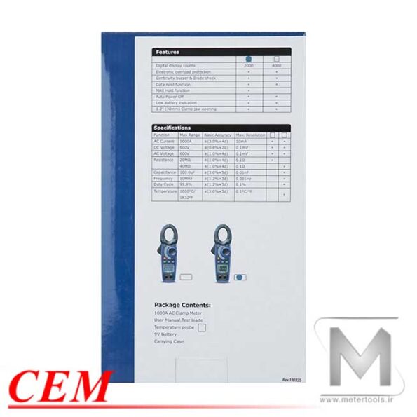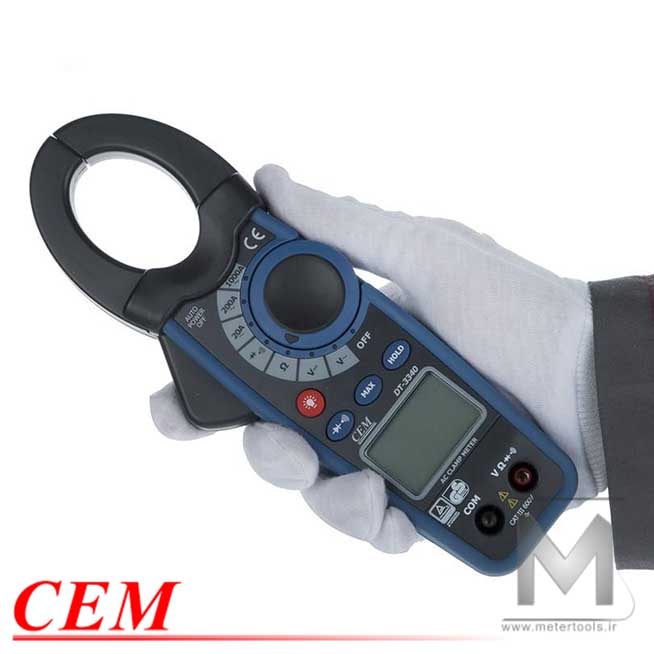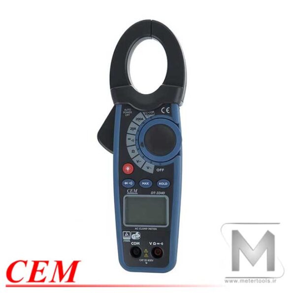 آمپرمتر کلمپی دیجیتال AC 1000A سی ای ام مدل CEM DT3340 با قابلیت اندازه گیری جریان متناوب AC در بازه 0 تا 1000 آمپر، ولتاژ AC/DC در بازه 0 تا 600 ولت، مقاومت الکتریکی در بازه 0 تا 20 مگا اهم، اتصال کوتاه، تست دیود و بیزر میباشد.
