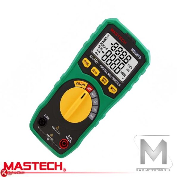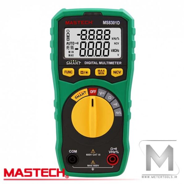 مولتی متر دیجیتال هوشمند MS8301D، قابلیت اندازه گیری ولتاژ AC/DC تا 600 ولت، مقاومت تا 10 مگا اهم و فرکانس تا 3 کیلوهرتز را دارا می باشد. همچنین این دستگاه دارای صفحه نمایش LCD با 6000 شمارنده و نور پس زمینه با قابلیت اتو رنج می باشد.