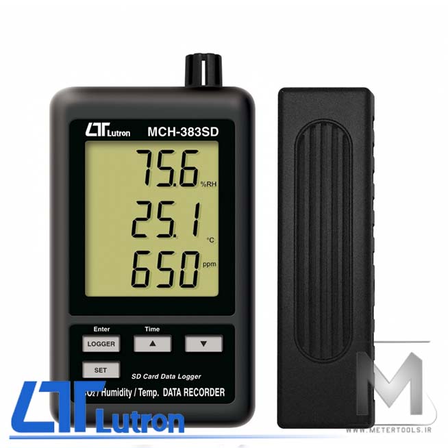 دتکتور گاز CO2 دی اکسید کربن محیطی Lutron MCH-383SD حافظه دار جهت مانیتورینگ و ثبت مقادیر محیطی پارامترهای CO2 ، دما و رطوبت محیط میباشد.