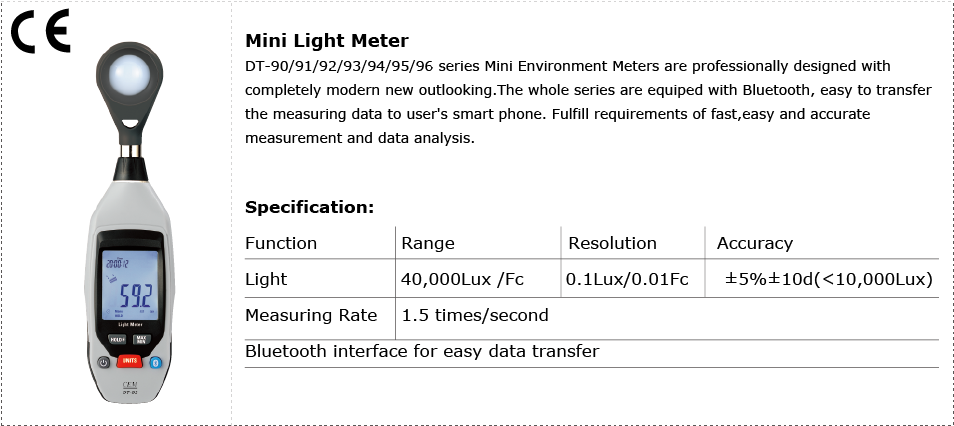 مدلDT-1301 یک دستگاه سنجش میزان نور با طراحی کوچک است، که به راحتی قابل حمل می باشد و مقادیر اندازه گیری شده را بر حسب واحد LUXE و FC بر روی یک LCD با ۲۰۰۰ شمارش نمایش می دهد.