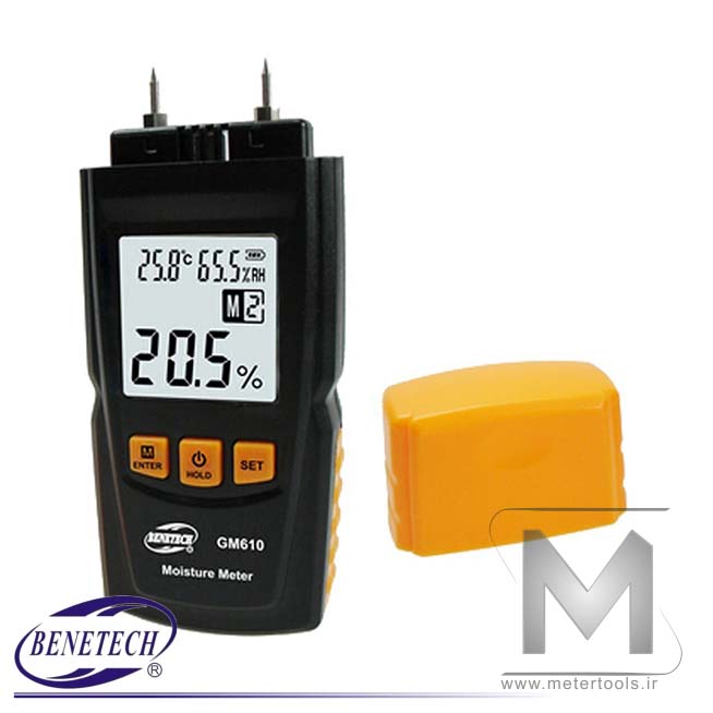 بنتک GM610 یک دماسنج و رطوبت سنح پرتابل نفوذی با رطوبت سنجی جامدات مانند چوب، ذغال، کاغذ و برخی از گیاهان با 4 حالت مختلف رطوبت سنجی بسیار دقیق ارائه شده است. بازه دما برای اندازه گیری دما محیط از 10- ~ 60 درجه سانتیگراد و همچنین اندازه گیری رطوبت محیط در بازه 20 تا %95 RH و رطوبت چوب تا %70 RH با حساسیت %0.1 و دقت %5 است.