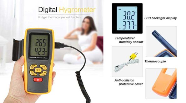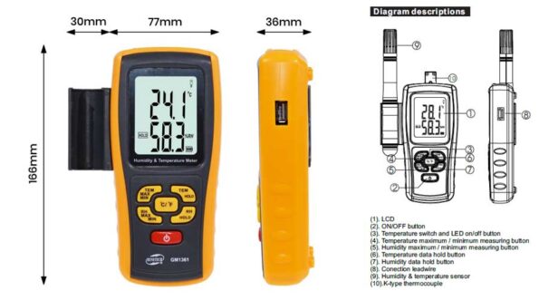 GM1361 یک دما و رطوبت سنج محیطی با محدوده دمایی منفی 10 تا 50 درجه سانتیگراد و محدوده رطوبت 5 تا 98 درصد RH با وضوح 0.1 است این دستگاه همچنین اتصال یک کانال ترموکوپل تماسی تایپ K با محدوده دمایی -50 تا 1200 درجه را پشتیبانی میکند. همراه پکیج یک پراب یک متری سیمی ارائه شده است که این پراب محدوده دمایی 40- تا 250 درجه را پشتیبانی میکند.