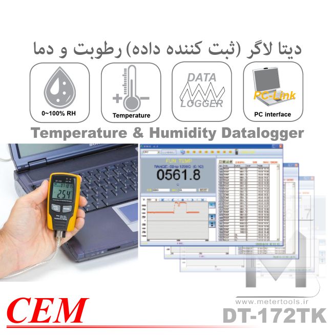 دیتالاگرهای CEM برای پایش و ثبت دما و رطوبت در محیط های مختلف و در بازه های زمانی کوتاه و طولاني کاربرد دارند. مقادیر اندازه گیری شده به راحتی توسط درگاه USB به کامپیوتر منتقل شده و توسط نرم افزار قابل مشاهده و ارزیابی است. نرخ نمونه برداری مدل DT-172TK از 1 ثانیه تا 24 ساعت قابل تنظیم میباشد.