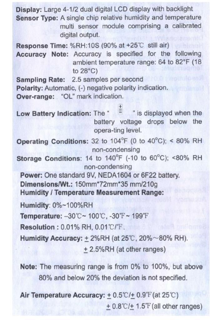 نمایشگر دوگانه بزرگ با نور پس زمینه، زمان پاسخ سریع 10 ثانیه، دقت بسیار بالا 2 درصد منفی 30 الی 100 درجه سانتیگراد، دمای تر مخزن 0 الی 80 درجه سانتیگراد، وضوح 0.1 درصدی برای رطوبت و دما، دارای توابع Min/Max و Hold، طراحی برپایه میکرو پردازنده و غیره…