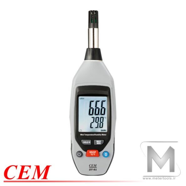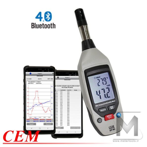 سنسور دما و رطوبت CEM مدل DT91 دارای رابط بلوتوث و نرم افزار اختصاصی برای انتقال راحت و نمایش و ذخیره همزمان اطلاعات بروی موبایل و تبلت.