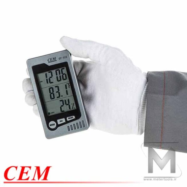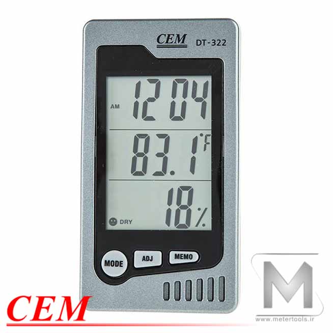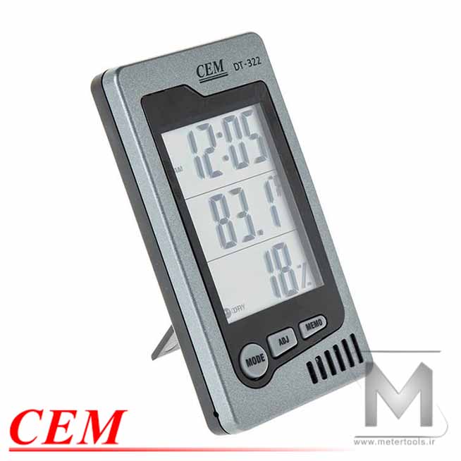رطوبت سنج و دماسنج دیواری و رومیزی CEM DT-322 با قابلیت اندازه گیری دما و رطوبت محیط (اتاق، سالن، انبار، سوله …) و نمایش همزمان ساعت و نیز ساعت زنگ دار از جمله دستگاه های با کیفیت میباشد که میتواند دما، رطوبت و زمان را به صورت همزمان و با دقت بالا بسنجد و نمایش دهد.