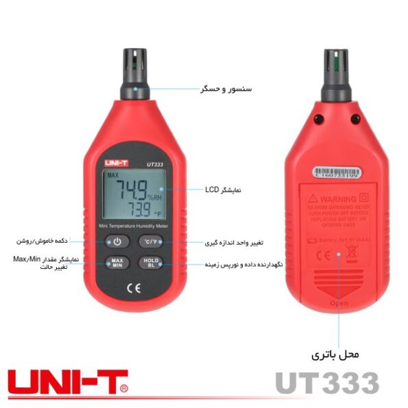 UT333 یک رطوبت سنج و دماسنج دیجیتال است که فناوری ماژول سنجش حساسیت دما و رطوبت را با دقت بالا برای نمونه برداری و پردازش داده کنترل می کند و نتیجه را برروی LCD نمایش می دهد. این دستگاه ماژول حساسیت کالیبره شده را استفاده می کند که باعث کاهش خطا و افزایش دقت میگردد. UT-333 بسیار سبک، جم و جور، ارگونومیک و کاربر پسند است که آن را تبدیل به ابزاری مناسب برای بررسی و نظارت بر کشاورزی، دامداری، ذخیره سازی انبار، امکانات عمومی و بسیاری از مناطق دیگر کرده است.