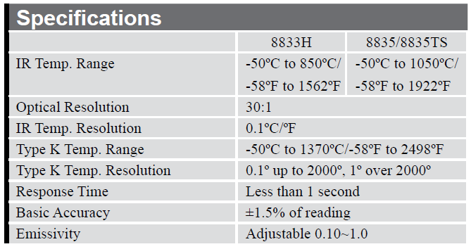 این سری از ترمومترهای مادن قرمز، خوانش سریع، آسان و دقیق برای اندازه گیری دمای سطوح بعلاوه یک ورودی ترموکوپل نوع Kو ذخیره مقادیر در ۲۰ خانه حافظه را فراهم می کنند.