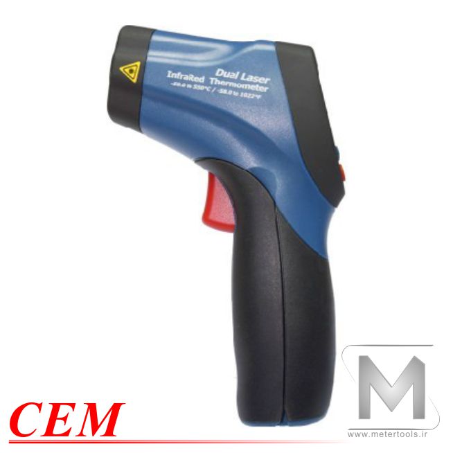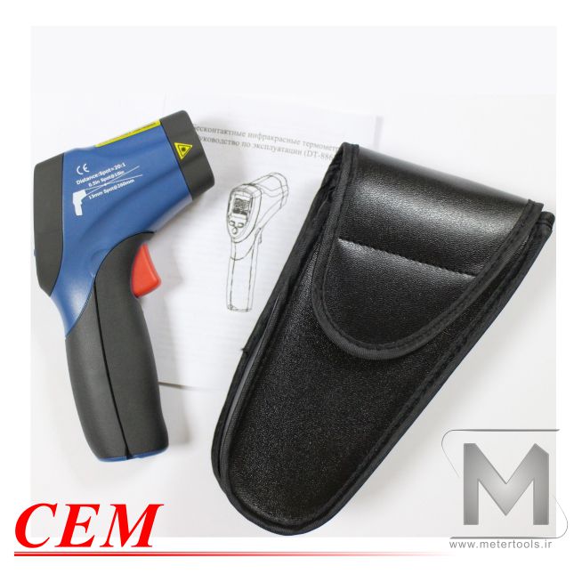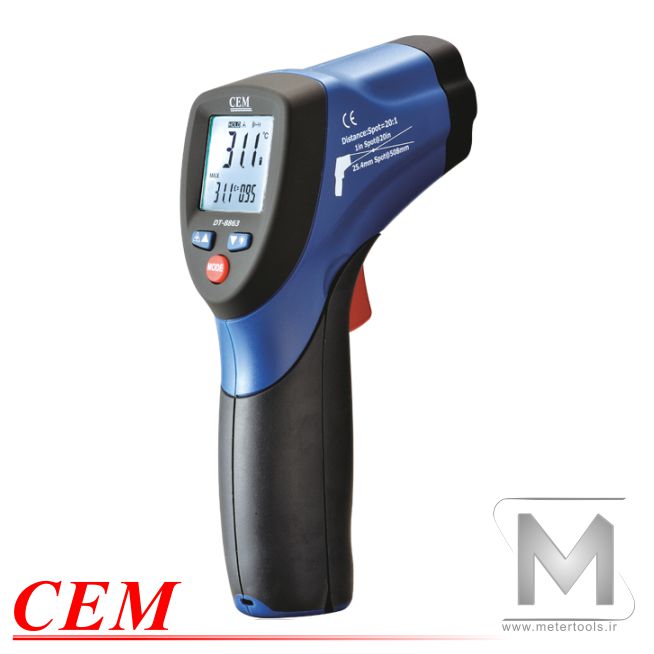 ترمومتر دو نقطه ای اینفرارد با دامنه دما از منفی 50 تا 800 درجه سانتیگراد مدل DT-8863 سی ای ام CEM دارای DS (Distance to Spot = حداکثر فاصله مجاز از شئ) 20 متری یک دماسنج غیر تماسی اینفرارد با طراحی ارگونومی با دقت بالا 1 درصد است.