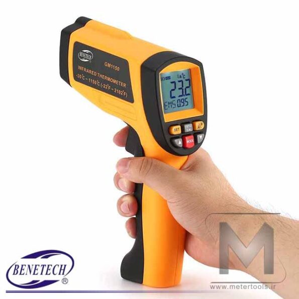 ترمومتر لیزری BENETECH GM1150 یک دماسنج غیرتماسی تفنگی با دقت 1.5% درجه سانتیگراد از برند بنتک است. از ویژگیهای مهم این ترمومتر لیزری میتوان به اندازه گیری بازه گسترده دمایی از 50- تا 1150 درجه سانتیگراد با وضوح 0.1 درجه و سرعت پاسخ سریع و فاصله به نقطه (DS:20) 20 متر و ضریب تابش (EMS) قابل تنظیم برای انواع متریال و سوئیچ تغییر سانتیگراد به فارنهایت اشاره کرد.