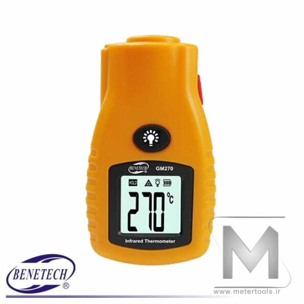 ترمومتر یا دماسنج لیزری ارزان قیمت BENETECH GM270 ، یک ترمومتر جیبی ارزان قیمت میباشد که قادر به اندازه گیری دمای سطحی نقاط مختلف از -32 تا 280 درجه سانتیگراد میباشد. از ویژگی های این دستگاه ، اندازه و سایز جیبی و کوچک ، وضوح یکدهم 0.1 ، تبدیل واحد از سانتیگراد به فارنهایت و برعکس ، طول لیزر 8 متری و اندازه گیری در حد 0.5 ثانیه و دقت 1.5% ، را میتوان اشاره کرد.