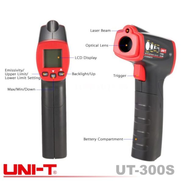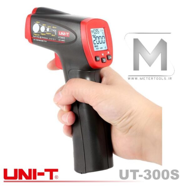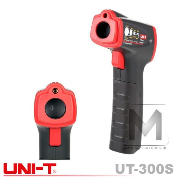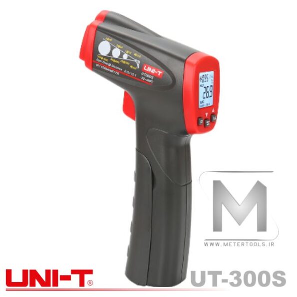 دماسنج غیرتماسی UT300S از تکنولوژی اینفرارد و مادون قرمز با دقت 2 درصد و محدوده دمایی منفی 32 الی 400 درجه دما را اندازه گیری میکند. حداکثر فاصله دستگاه تا شی مورد نظر 12 متر (DS=12:1) میباشد.